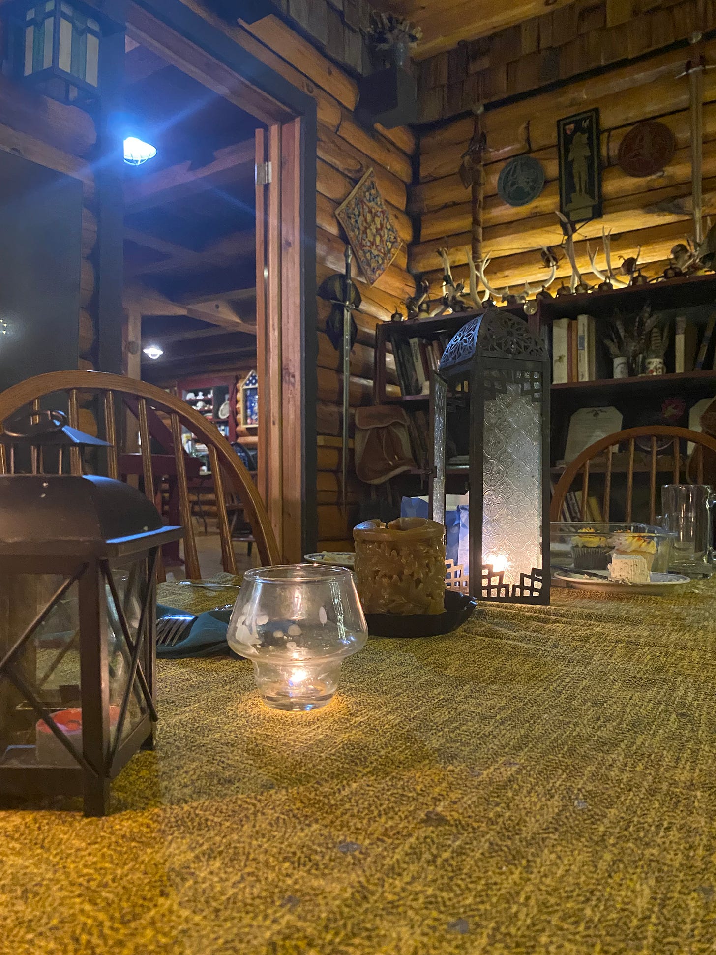 At some point, Brian and I walk around the cabin taking in all its little delights. Birds nests rested on beams. Glass bottles full of feathers lined the ceiling in the living room. Large branches stood in pots, adorned with fairy lights. The stone and mortar of a fire place had little bones, fossils, and Jody’s children’s teeth embedded within it. With my friend Steve, we adorned tables with cloth and lanterns. At one point, Brian approached a hutch where a book had been lain. Brian tilts his head in interest as I approached. Oh, I know this book! I told him while picking it up. I held it up to Jody and told her my amusing anecdote about the book.