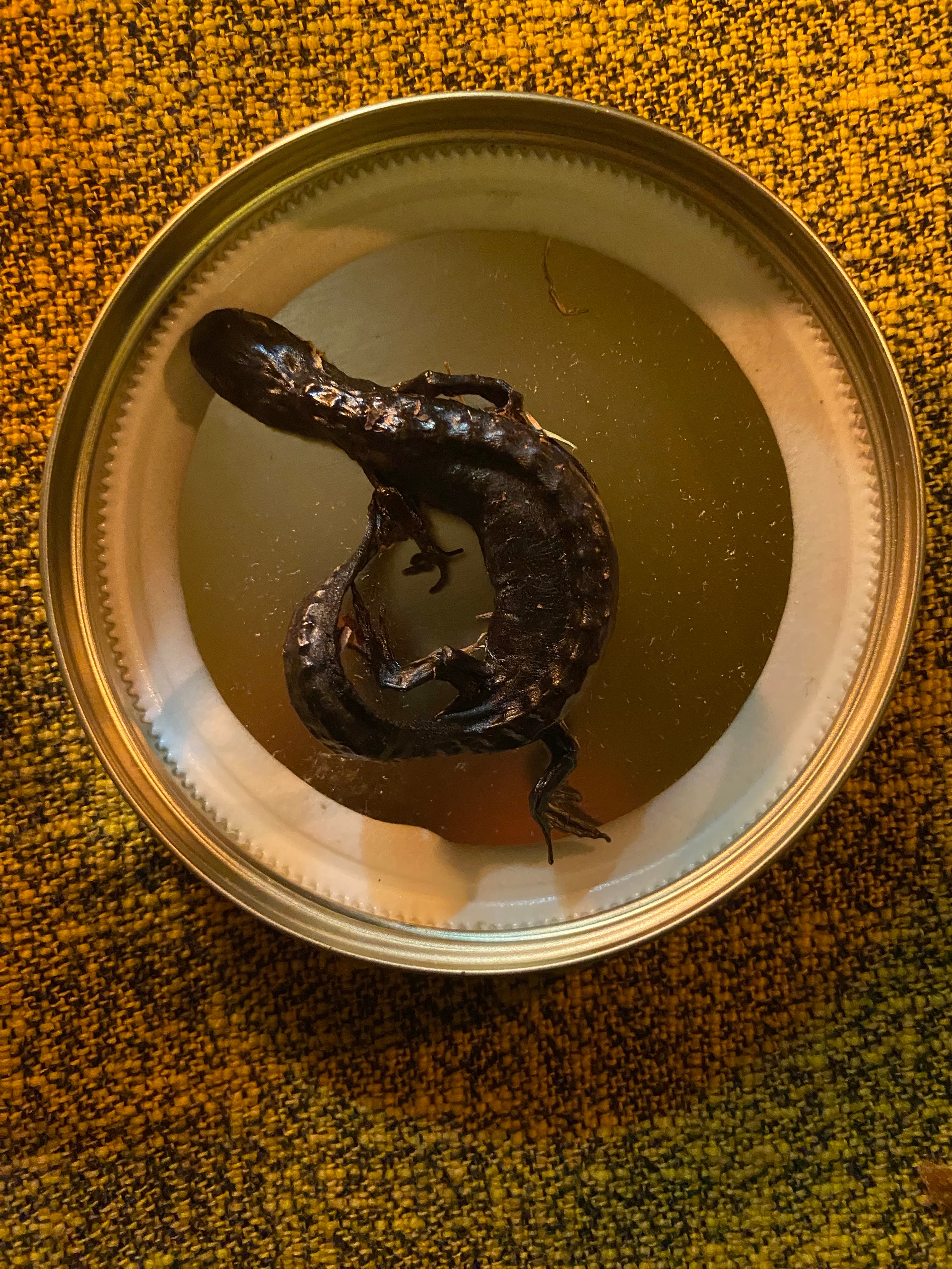 Dinner was served. The conversation, an unintended game of association, went from tornadoes to cow-patty hail to birding to insect frass to cicadas to a drowning victim turning out to be a sex doll to finding condoms in streams to how condoms were used to make falcon hoods (which Jody had on display on a mantle in the same room), to salamanders. At the mention of salamanders, Cynthia brought out a jar containing a dried, preserved Jefferson salamander. She had found the salamander dead, likely having gotten stuck under a glaze of ice. We passed the brittle body around the table, running our fingers along the knife’s edge ridge of their back.