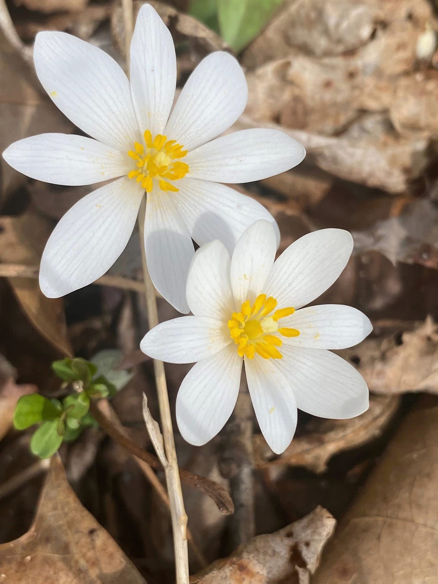 In my yard, hands on my hips, I look down at the collage of green foliage at my feet. I look for the familiar whorls and hues of ephemeral leaves. I count seven Bloodroot blossoms, little yellow faces with their manes of white. My favorite stage of their growth is just before the bloom when the lobed leaf is wrapped around the stem like a cloak. The flower appears to be holding its face in despair. Staring down at them, I feel my arms begin to wrap around my body.